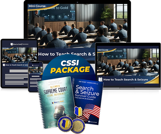 The Certified Search & Seizure Instructor (CSSI) program is an advanced instructor-level certification designed to ensure that those teaching Fourth Amendment law are doing so accurately, defensibly, and in line with current appellate and Supreme Court decisions.